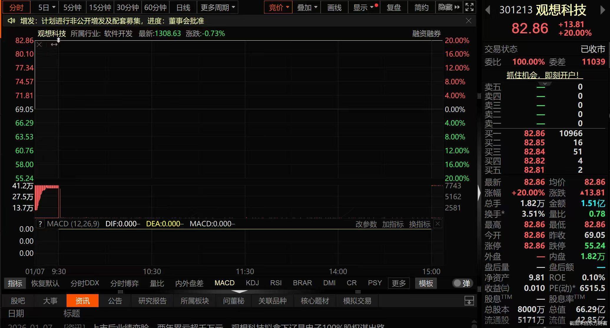 情显示交往行,7日1月,一”字涨停观思科技“,收盘截至,价82.86元/股公司股价收于涨停,.51亿元成交金额1,6.29亿元最新总市值6。